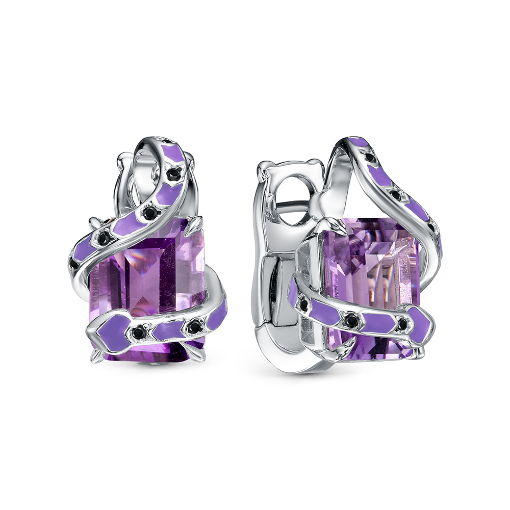 Серьги из серебра 925 пробы с шпинелью, аметистами и эмалью