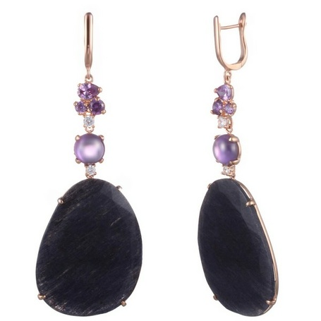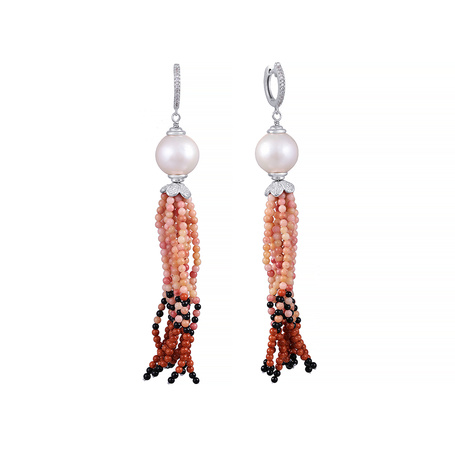 Серьги из серебра 925 пробы с авантюринами синтетическими, родонитами, ониксом, фианитами и жемчугами