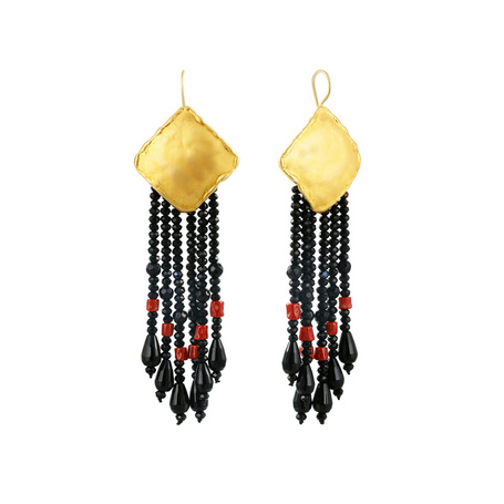 Серьги из нет металла с ониксом, бисером, кораллом синтетическим и сталью
