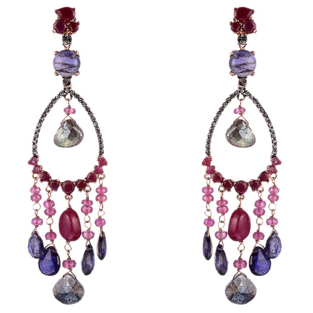 Серьги из серебра 925 пробы с лабрадоритами, рубинами облагороженными, иолитами и фианитами