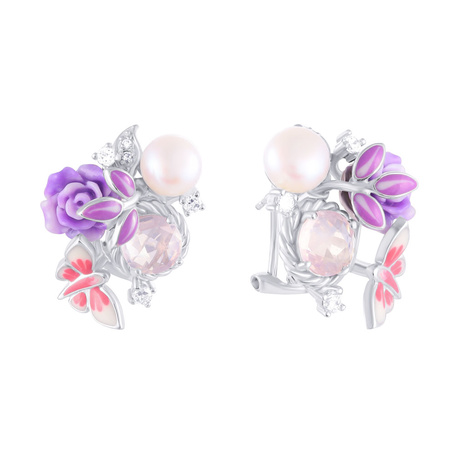 Серьги из серебра 925 пробы с кварцем, жемчугами, силиконом, эмалью и фианитами